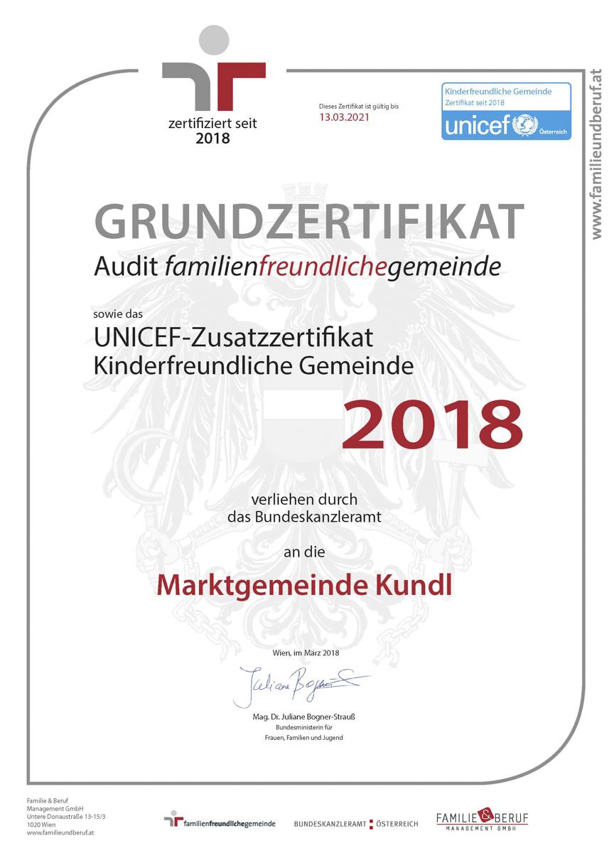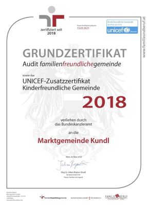 Durch die konsequente Umsetzung vieler großer und kleineren Projekte und Verbesserungsmaßnahmen wie z.B. Ausbau des Angebotes an Spielplätzen, Babysitterkurs, Sonnenschutz, barrierefreies WC und Wickelmöglichkeit im Kundler Schwimmbad bzw. dem Einbau eines Liftes beim Restaurant Millenium erhielten wir das Zertifikat „familienfreundliche Gemeinde“ sowie das UNICEF-Siegel als „kinderfreundliche Gemeinde“. 2016 versprochen und gehalten.